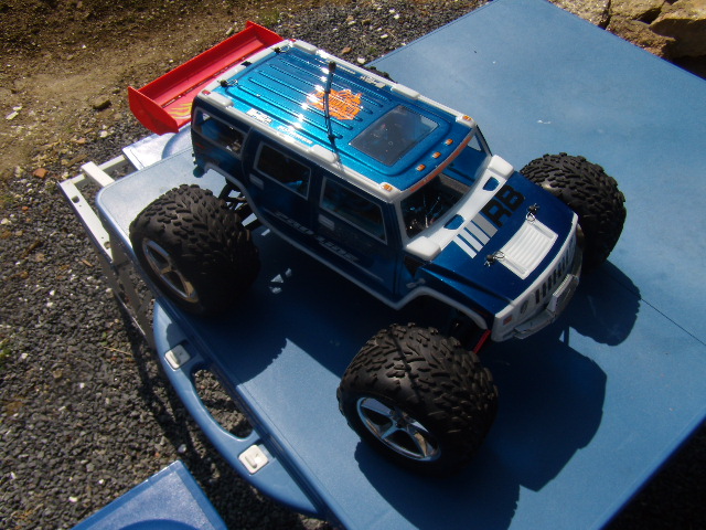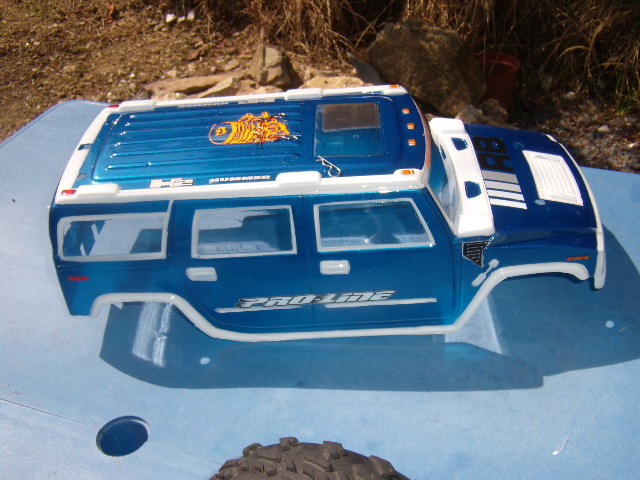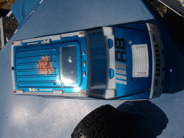 voila ma carrosserie de mon revo 2.5 en hummer h2 en bleu et blanc je ne suis pas un espère en peinture