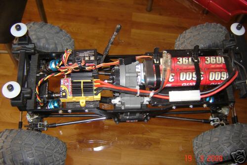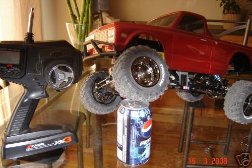 Here we have my custom rc rockcrawler pro-line chevy. It has HPI savage bumpers and T-max body mounts, so they are adjustable. The chassis is a k2 that I painted black. The tranny is out of a stampede, has metal gear installed and is locked. The motor is an integy 35turn lathe motor with a 14 tooth pinion. The driveshafts are out of a stampede also and have metal yokes. Axles are tlt-1 with bearing upgrade and are locked. The shocks are aluminum threaded body from a tamiya touring car and work flawlessly. I'm including a jr xs3 synthesized radio, receiver xl5 speed controler a hitec 5625 servo and a z590 servo(both with metal gears and servo horns). Only thing needed are 8 AA's and a battery pack. This truck needs absolutetly nothing else, it has aprox. 1 hour of use since built and has 4-wheel steering. Buyer will not be disapointed. I may have forgotten some stuff so feel free to e-mail me any questions. Shipping will be free of charge in Canada or US